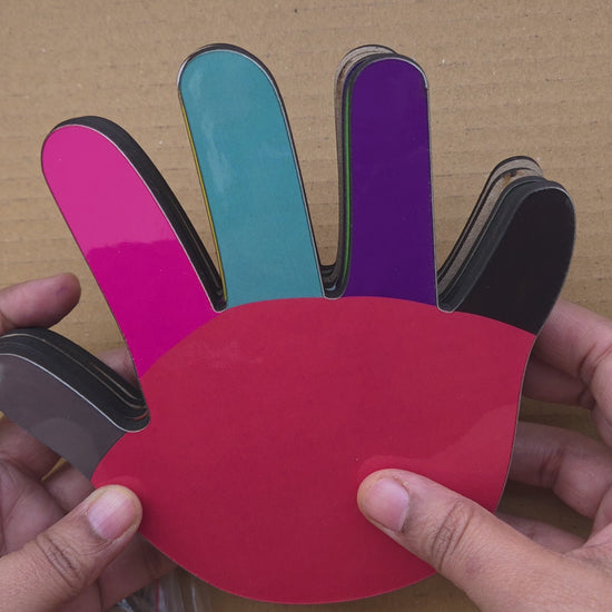 Children place their hands on the colorful hand templates where each finger is marked with a different color. Using the colored chips as visual cues, they lift the corresponding fingers, creating endless color combinations and patterns. Start with one hand, progress to alternating hands, then challenge them with both hands simultaneously - each following different color sequences!